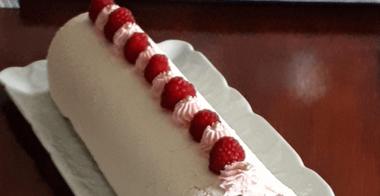 Décor : Glaçage fait avec 150 g de coulis de framboises, 100g d’eau, 80 g de sucre, jus de citron et 3 feuilles de gélatine. On le laisse refroidir, épaissir et couler sur la bûche congelée, posée sur une grille.
