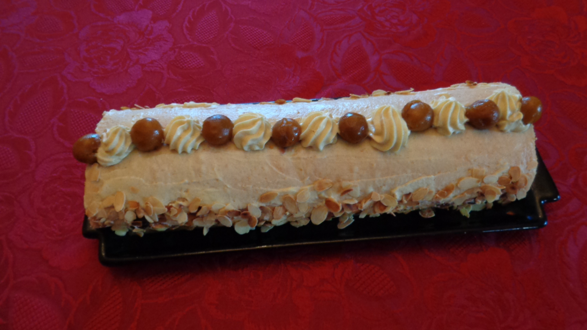 Coller tout le long du roulé, des 2 côtés et sur une hauteur de 3 à 4 cm, des amandes effilées grillées. Sur le dessus du roulé, former des rosaces, avec le reste de la crème et à l’aide d’une seringue à pâtisserie. Disposer 5 mirabelles entre ces rosaces.