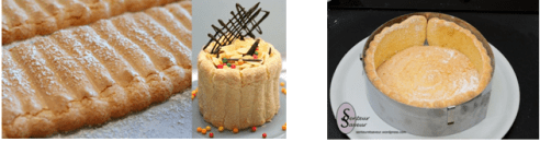 Pour faire une charlotte, on peut les coucher en cartouchière (pocher les uns contre les autres en laissant un mini espace) et dresser aussi deux cercles, les cuire, les mouiller avec un sirop. Entourer de biscuits l’intérieur d’un moule, déposer un cercle de biscuit au fond, y verser par exemple une simple mousse au chocolat montée à la crème fraiche, seule ou mélangée avec quelques morceaux de poires ou de bananes caramélisées ou encore des fruits rouges, poser le deuxième cercle et finir par la mousse au chocolat. Décorer d’amandes effilées et d’une grille en chocolat.