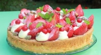 Dressage : Etaler le confit de fraises sur la surface du biscuit moelleux. Pocher des grosses gouttes de chantilly en commençant par la périphérie puis au centre du biscuit. Laver, équeuter 350g de fraises, les couper en deux, les saupoudrer de sucre glace, les placer sur le gâteau. Ajouter les amandes caramélisées entières, des groseilles (c’est facultatif) et quelques feuilles de menthe ou de basilic.