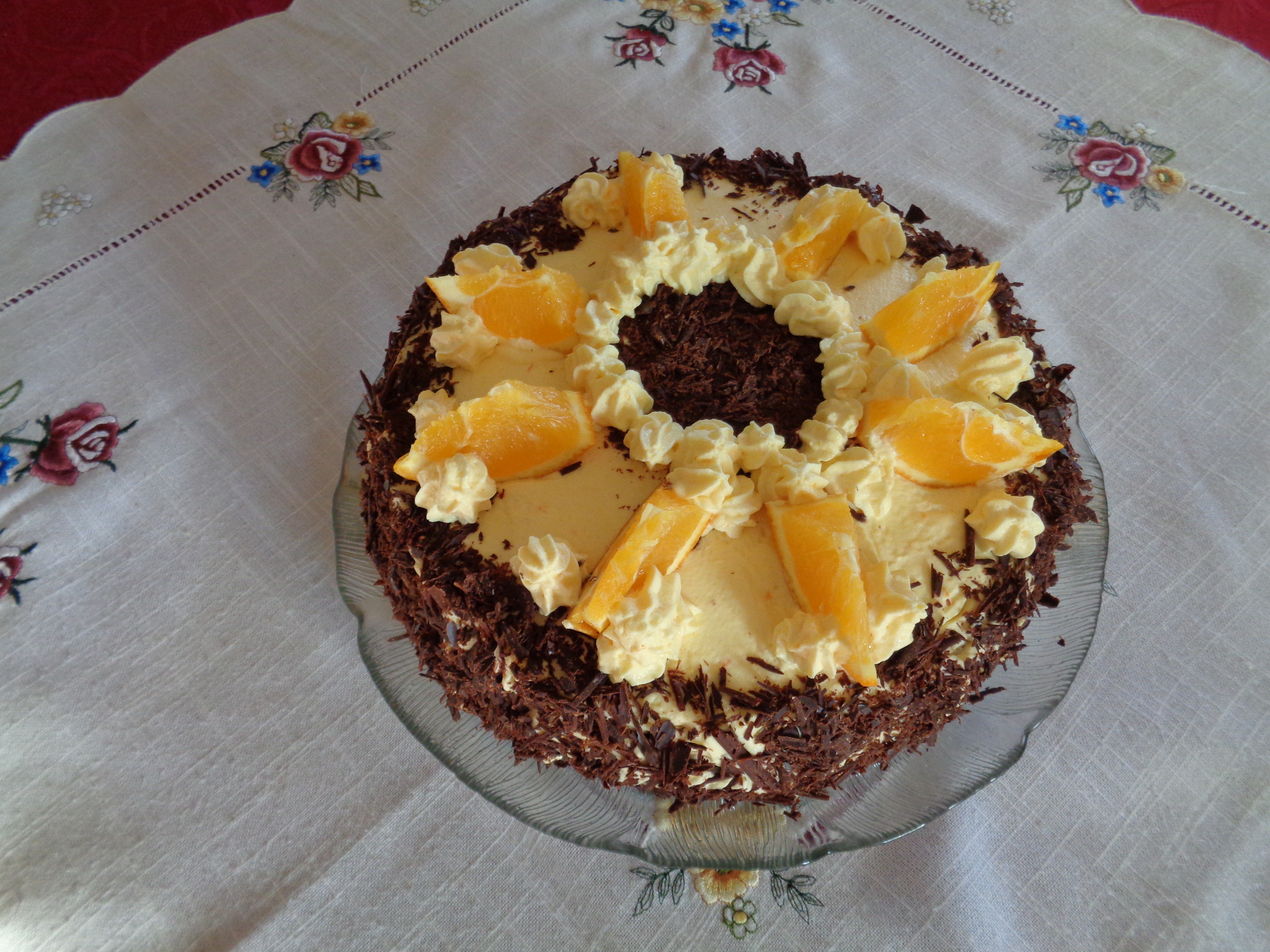 Couper le biscuit en deux tranches horizontales. A l’aide d’un pinceau, imbiber le biscuit de sirop au Cointreau. Disposer la crème pâtissière sur une tranche de biscuit, disposer dessus quelques morceaux d’orange (facultatif). Reformer le biscuit et l’enrober entièrement de crème pâtissière réservée. Garnir le tour de chocolat râpé. Décorer le dessus d’un rond de chocolat râpé, de rosettes de crème à l’aide d’une douille et de quartiers d’orange.