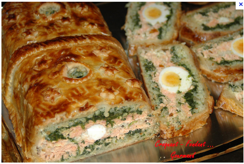 500 g de saumon frais, 100 g de riz rond, 250 g de champignons, 300 g d’épinards frais ou 200 g d’épinards surgelés, 6 œufs (4 cuits durs, 1 pour lier et 1 pour la dorure) 3 c. à s. de crème épaisse, échalotes, aneth ou ciboulette, 2 rouleaux de pâte feuilletée.