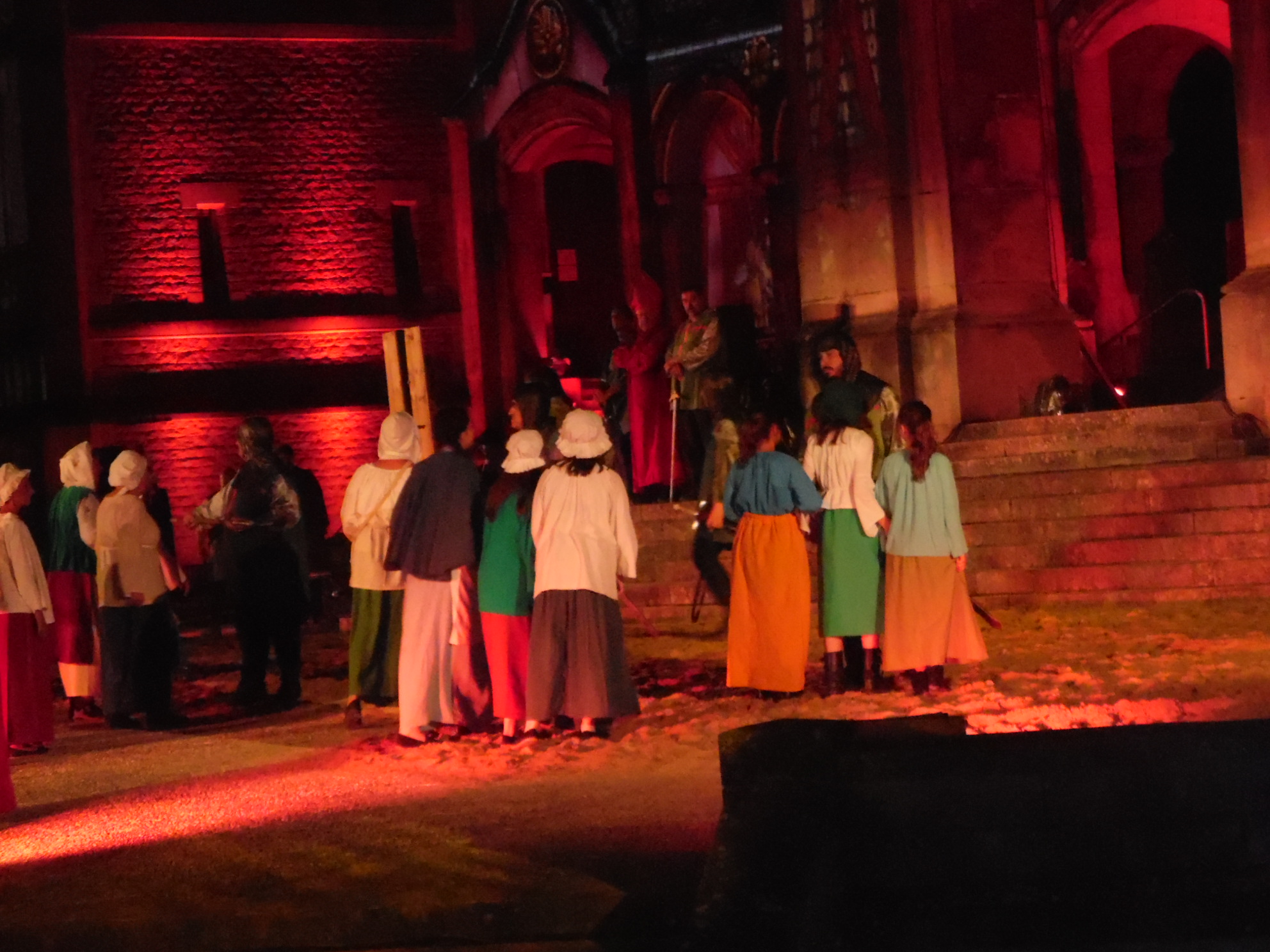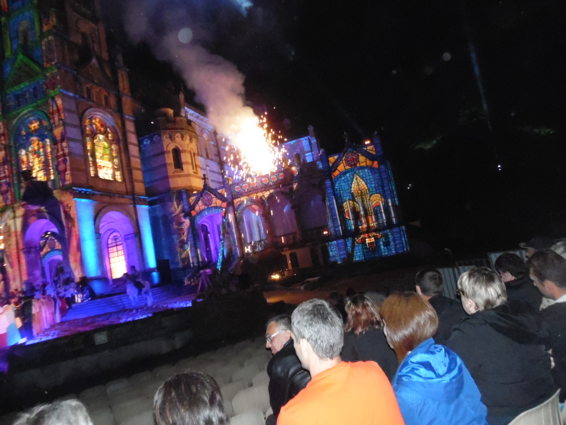 Devant la façade de la basilique du Bois Chenu à Domrémy, ce spectacle est construit de manière cinématographique avec des projections vidéo en 3D et des illusions d’optique et avec plus de 200 intervenants sur scène.